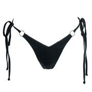 Uniquely designed with front ring accents, side ties, and a super sexy thong cut back. Featuring a soft, stretchy, luxe fabric that hugs every single curve. Featuring thin strap sides and a v-shaped front. Show off your daring swimwear style and be the envy of many beach-goers. All in a chic and sleek design - it's time to make waves!