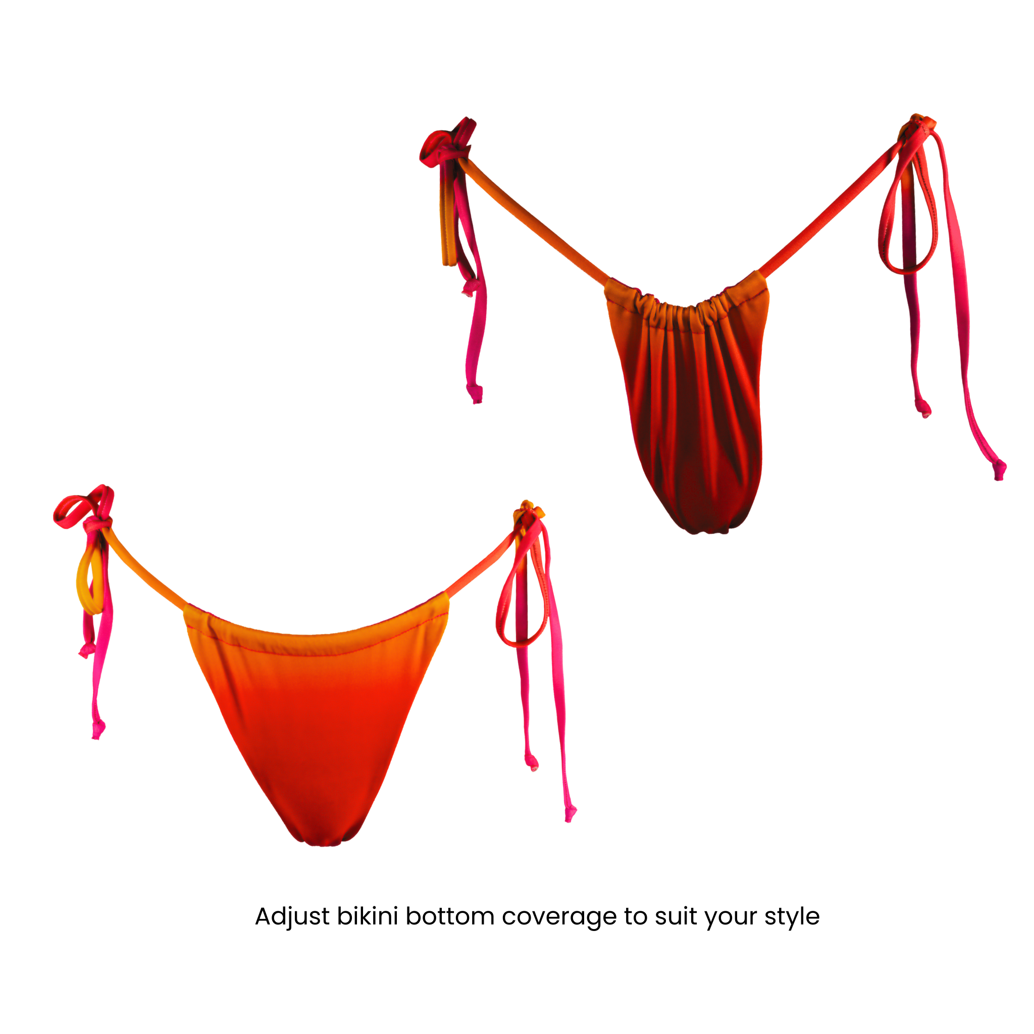 • Slide bikini bottom, which can be adjusted and worn to suit your taste and occasion